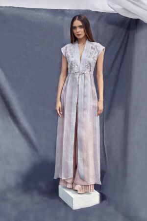 Green natural spun silk cape with a hand embroidered collar. It is paired with a pair of muga silk trousers with pocket details. Colour customization is possible.
